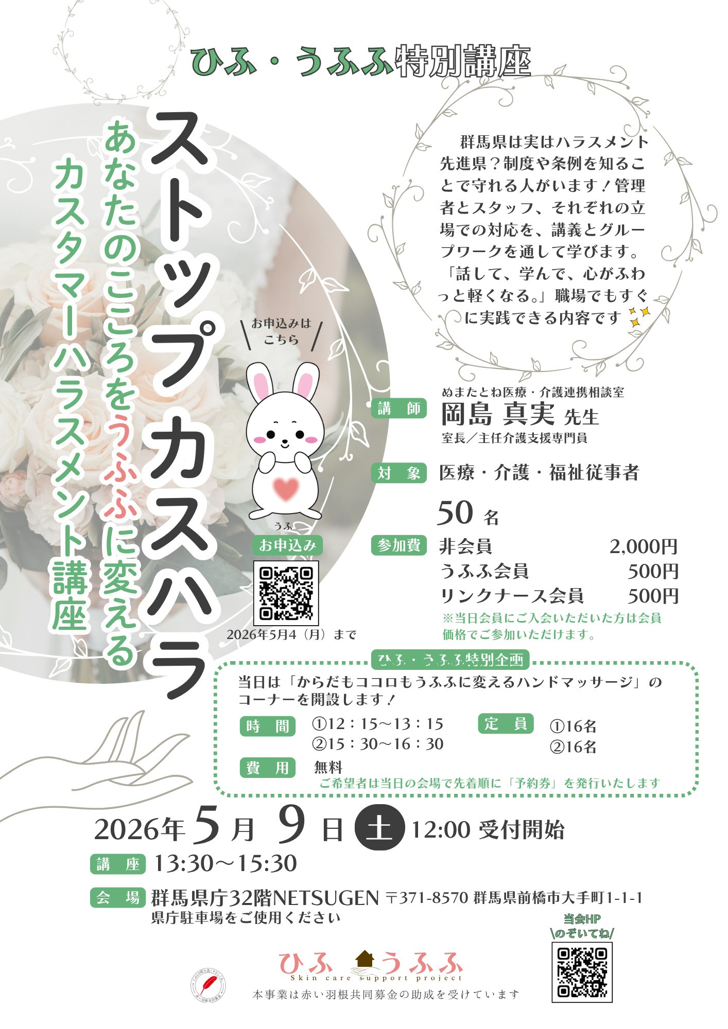 はじめまして スキンケアサポートプロジェクトひふ・うふふ です。このたび、ひふ・うふふのホームページを開設いたしました。ひふ・うふふの情報や活動の様子は、こちらのホームページと Instagram でご紹介させてい ただきます。ひふ・うふふらしいページを、みなさまと一緒に創り上げて行きたいと思っております。みなさま、どうぞ「ひふ・うふふ」をよろしくお願いいたします