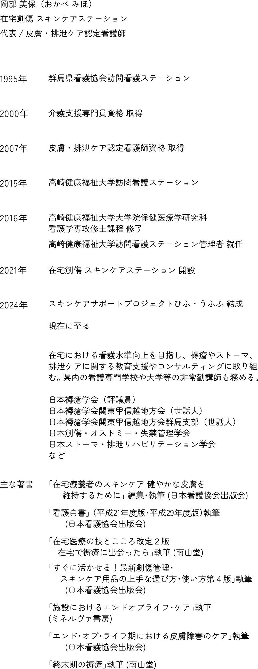 スキンケアは、生まれた瞬間から、一生を通して毎日行われるケアです。しかし人は、毎日 のスキンケアを軽視しがちであり、皮膚にトラブルや傷ができた時、ようやく予防的・治療 的スキンケアの重要性に気付きます。 わたしたちは、地域におけるスキンケアの課題を共有する医療・介護・福祉・教育に携わる 専門家の集団です。