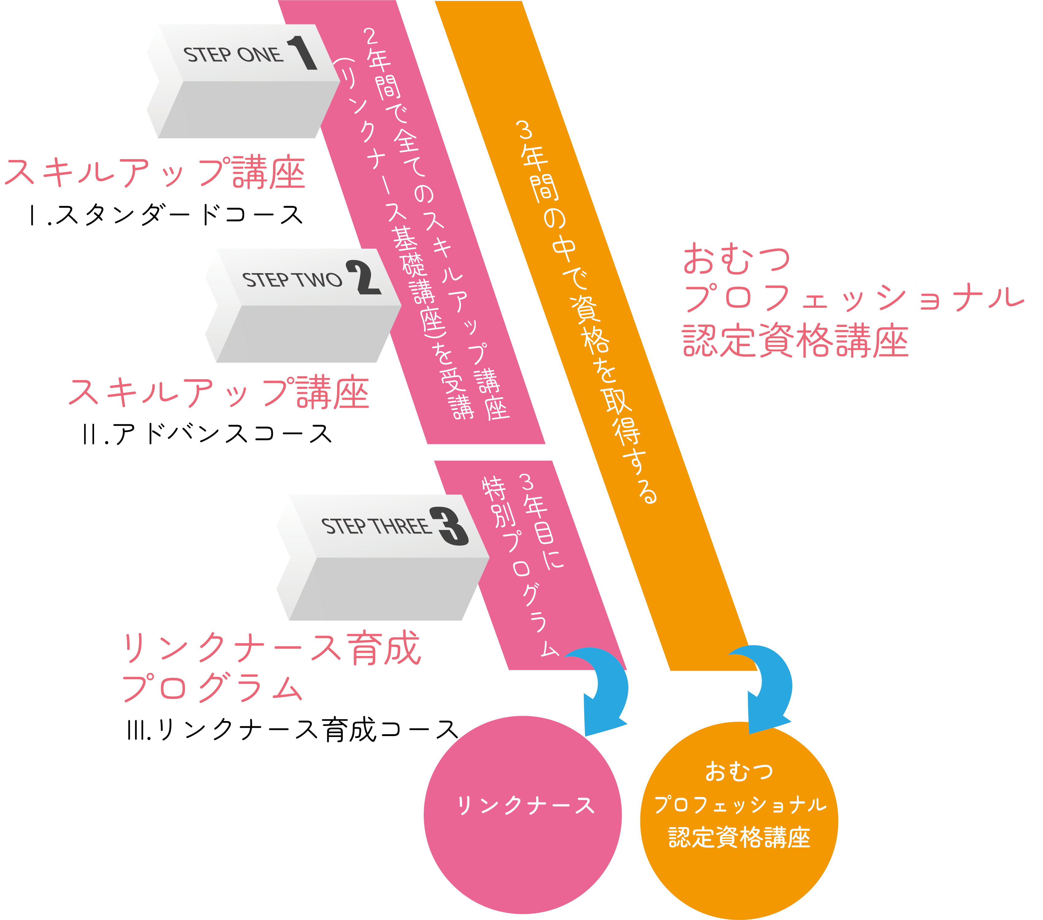 - リンクナース会員は、スキルアップ講座の全てを2年間で受講し、3年目にリンクナー ス育成コースへ進みます(3年間の中でおむつ認定資格も取得していただきます)